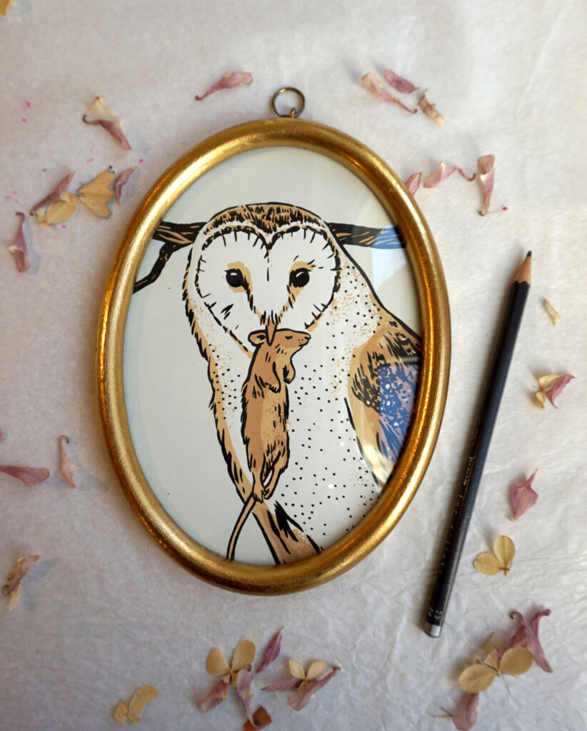 Es ist wieder so weit. Es gibt fünf neue Bilderrahmen. Die Motive in den Bilderrahmen sind Original Siebdrucke von mir gezeichnet und gedruckt. Diese schönen alten Bilderrahmen neu zu bestücken, ist eins meiner Lieblingsprojekte. Die neuen Rahmen sind alle aus Holz und verglast nur die Spinne nicht. Dieser Rahmen ist aus Kunststoff. Jedes Bild hat an der Rückseite einen Haken für die Aufhängung.